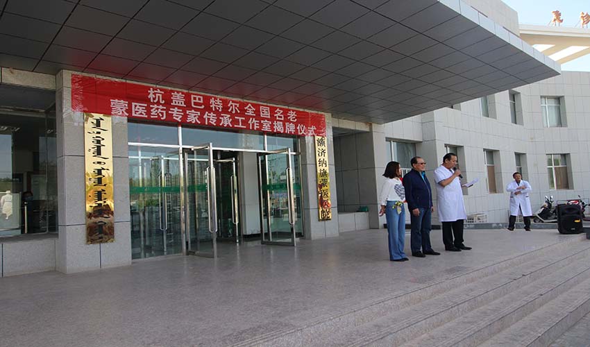 2018年全国名老蒙医杭盖巴特尔传承工作室团队前往阿拉善盟额济纳旗蒙医医院,进行传承工作室揭牌成立活动,活动结束后在医院进行拜师收徒仪式,在收徒仪式后为蒙医医院工作人员进行了专题讲座,并在医院进行为期两天的坐诊活动。